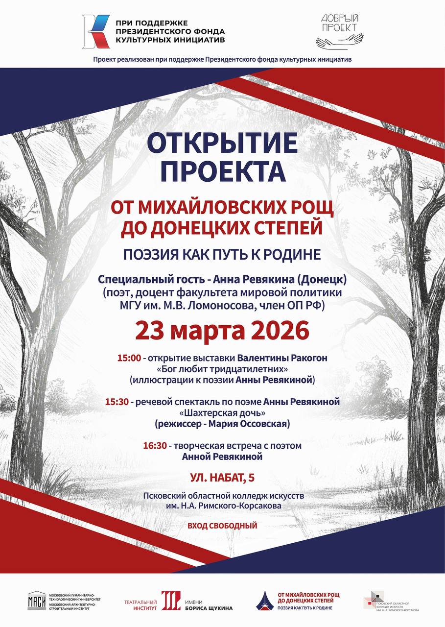 ГАОУ ДО «Лидер» сообщает о предстоящем открытии проекта «От михайловских рощ до донецких степей», организованного Псковским областным колледжем искусств им. Н.А. Римского-Корсакова.