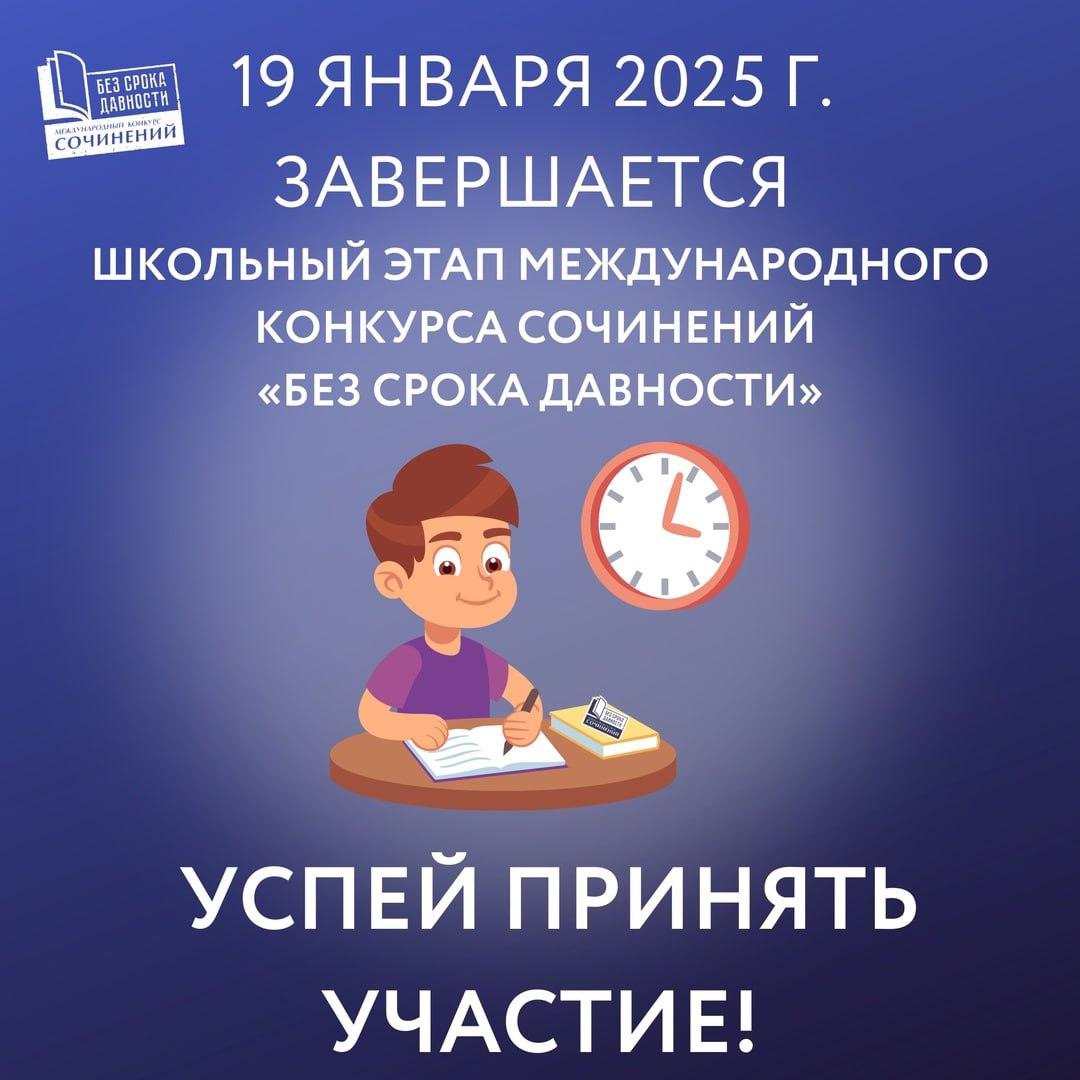 Дорогие друзья! Остался ровно месяц до окончания приема заявок на Международный конкурс сочинений «Без срока давности». До 19 января поторопитесь принять участие в самом масштабном международном конкурсе патриотической направленности. Расскажите историю своей семьи, поделитесь информацией, полученной из архивных источников, расскажите о прочитанной книге или фильме по тематике проекта «Без срока давности! Внесите свой вклад в сохранение истории своей страны! Во время подготовки к сочинению пользуйтесь методическими рекомендациями.